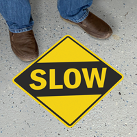 We use these signs, with arrows to indicate direction of forklift traffic, to alert team members that they are about to step into a traffic lane. The signs are high visibility and readily seen by those on foot. The only issue we have had with the signage is that the wording gets worn off with constantly being run over by forklifts. Foot traffic has little effect on the signage.