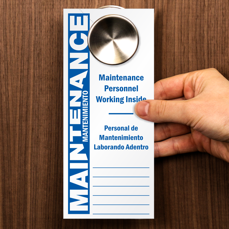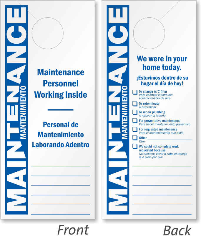 With message in English and Spanish, this hang tag informs residents about the ongoing maintenance work inside. Great for Hispanic communities and apartments.