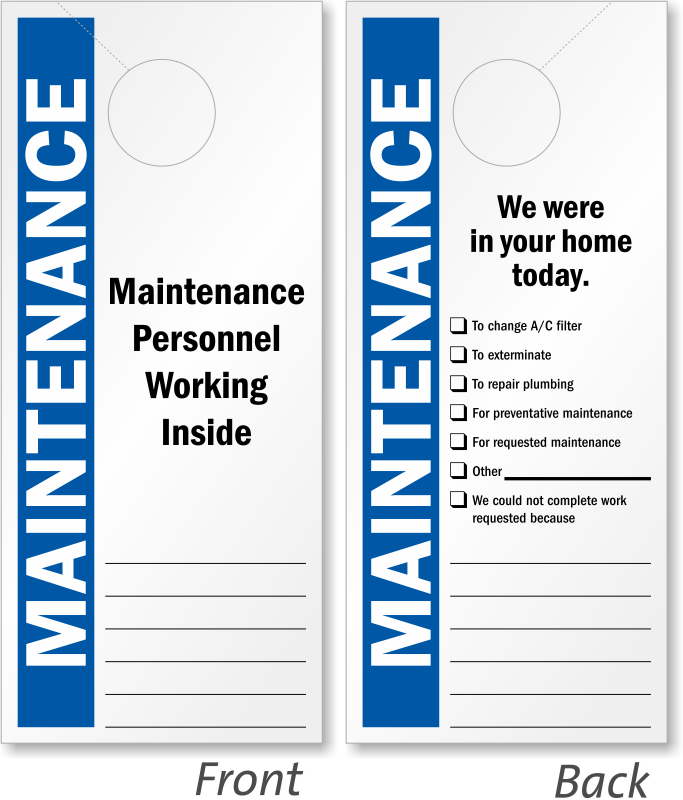 Use this double-sided maintenance tag to notify residents of entry and the reason for the visit. Writable surface accepts pen or marker.