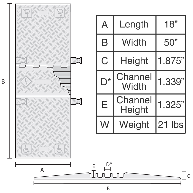 ADA 5-Channel Cable Protector are equipped with built in ADA accessible ramps and a reinforced hinged lid for top load cable placement.