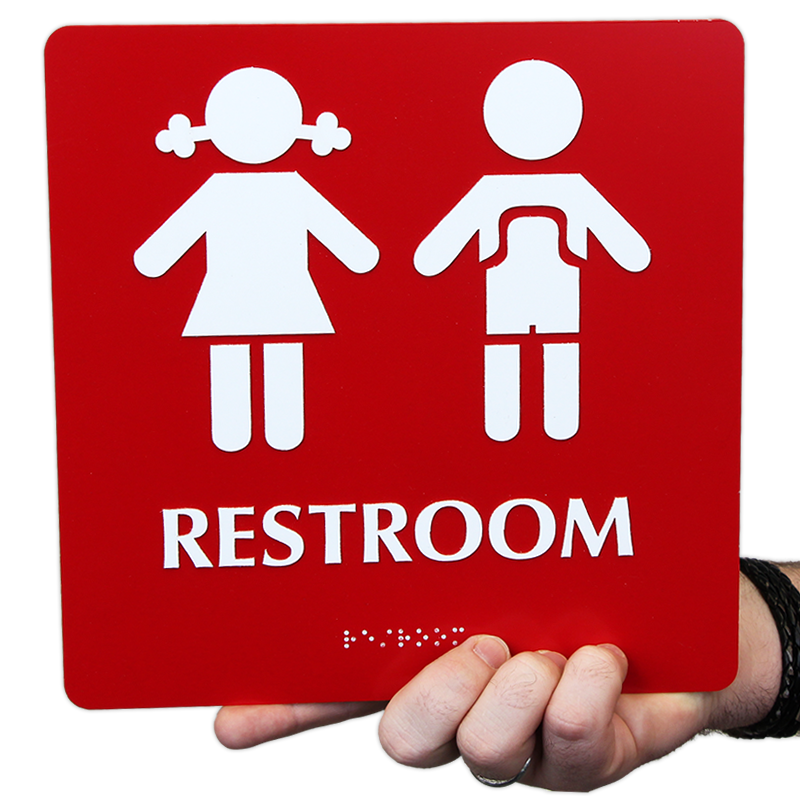 - Sign shows child-friendly symbols (adjacent boy and girl figures) and complies with ADA standards.
