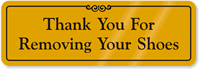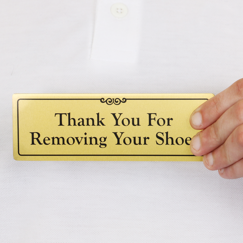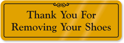 Finest quality aluminum sign that politely reminds people to remove shoes. Vibrant gold color creates a lasting appeal. Graphics are embedded - so your sign will outlast the door and heavy-traffic abuse!