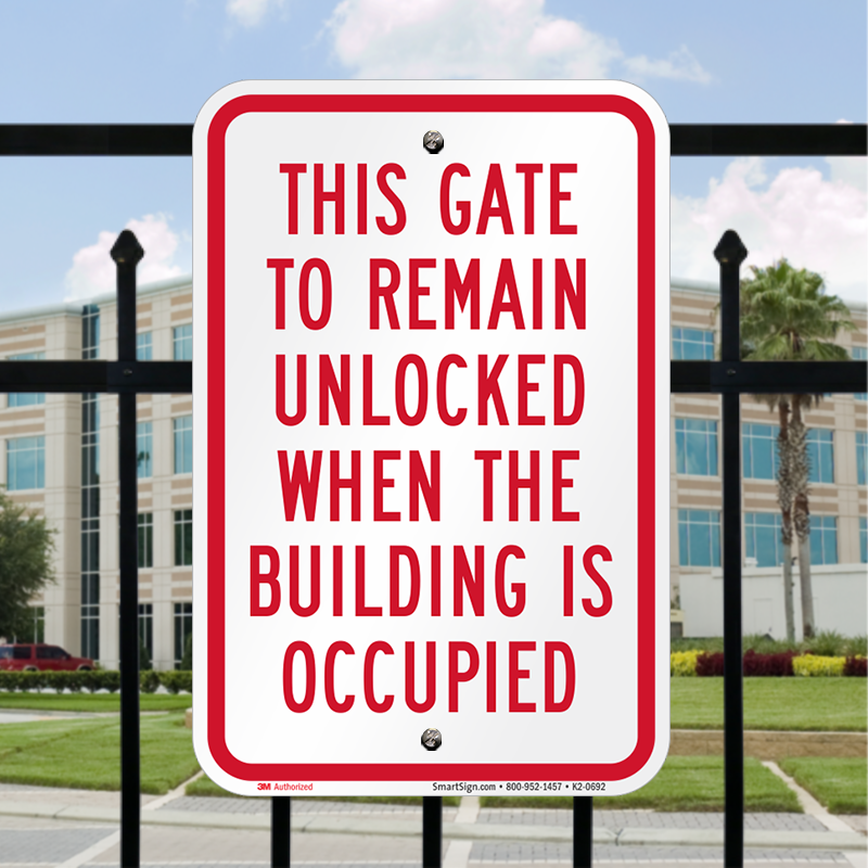 Garage Sign: This Gate To Remain Unlocked When The Building Is Occupied K2-0692 Learn More...