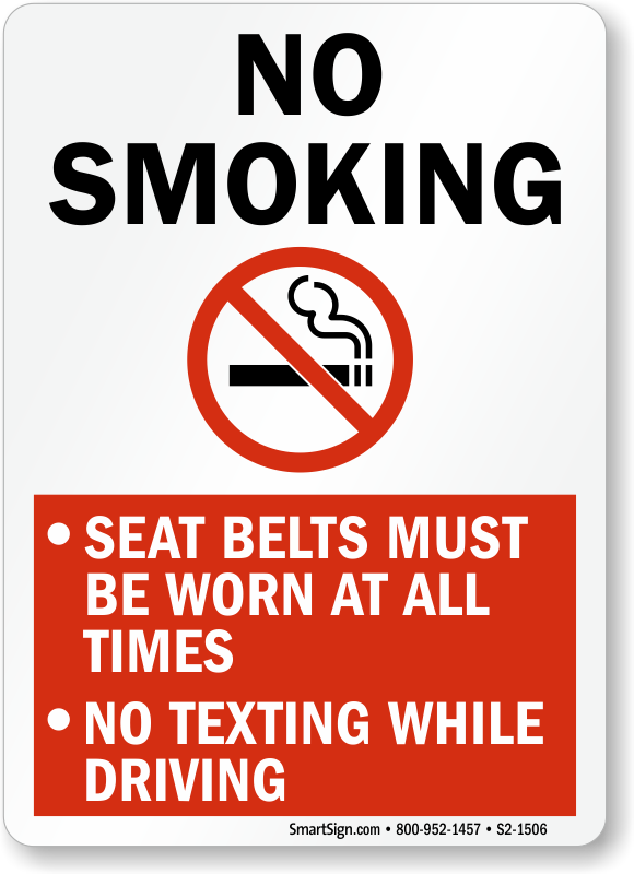 Prevent potential road accidents. Use this sign to prohibit drivers from smoking or texting while driving and remind them to put their seat belt on.