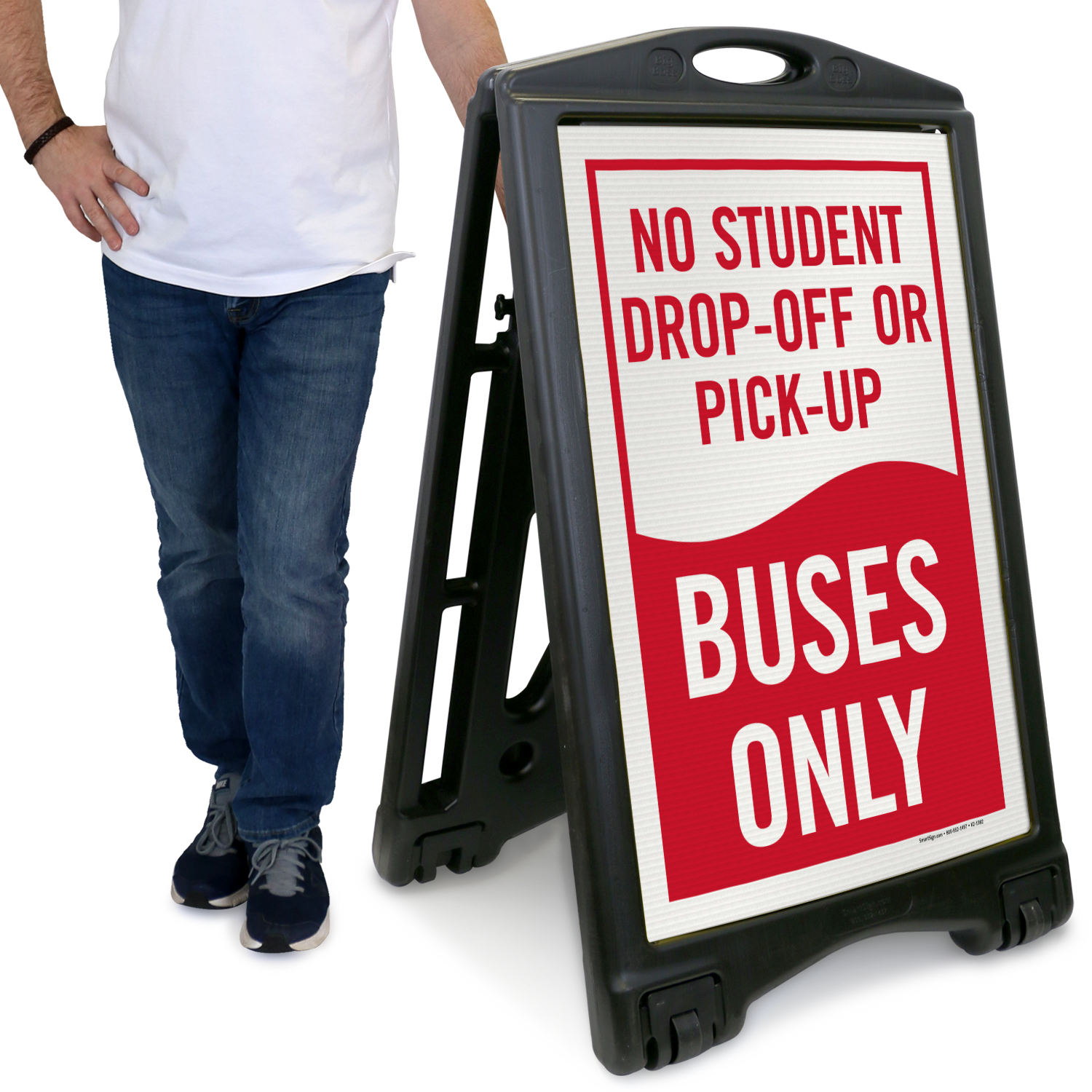 Use this portable sidewalk sign kit to mark the parking space reserved for buses at your facility and prohibit drivers from using the area for drop-off or pick-up.