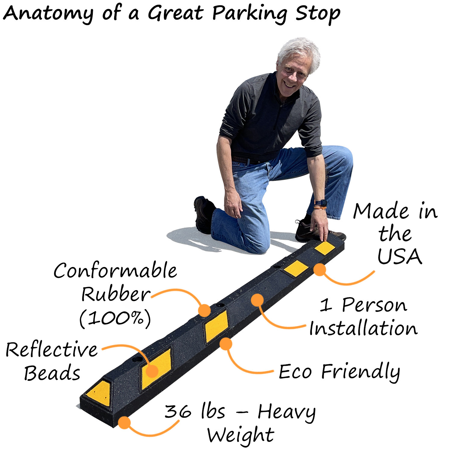 • Comformable Rubber. Rubber stops do not crack, chip or crumble in the weather. Unless your lot is brand new and made to an exacting standard, parking spaces are likely to be tilted or have slight imperfections. Rubber wheel stops flex and conform to these inevitable imperfections.