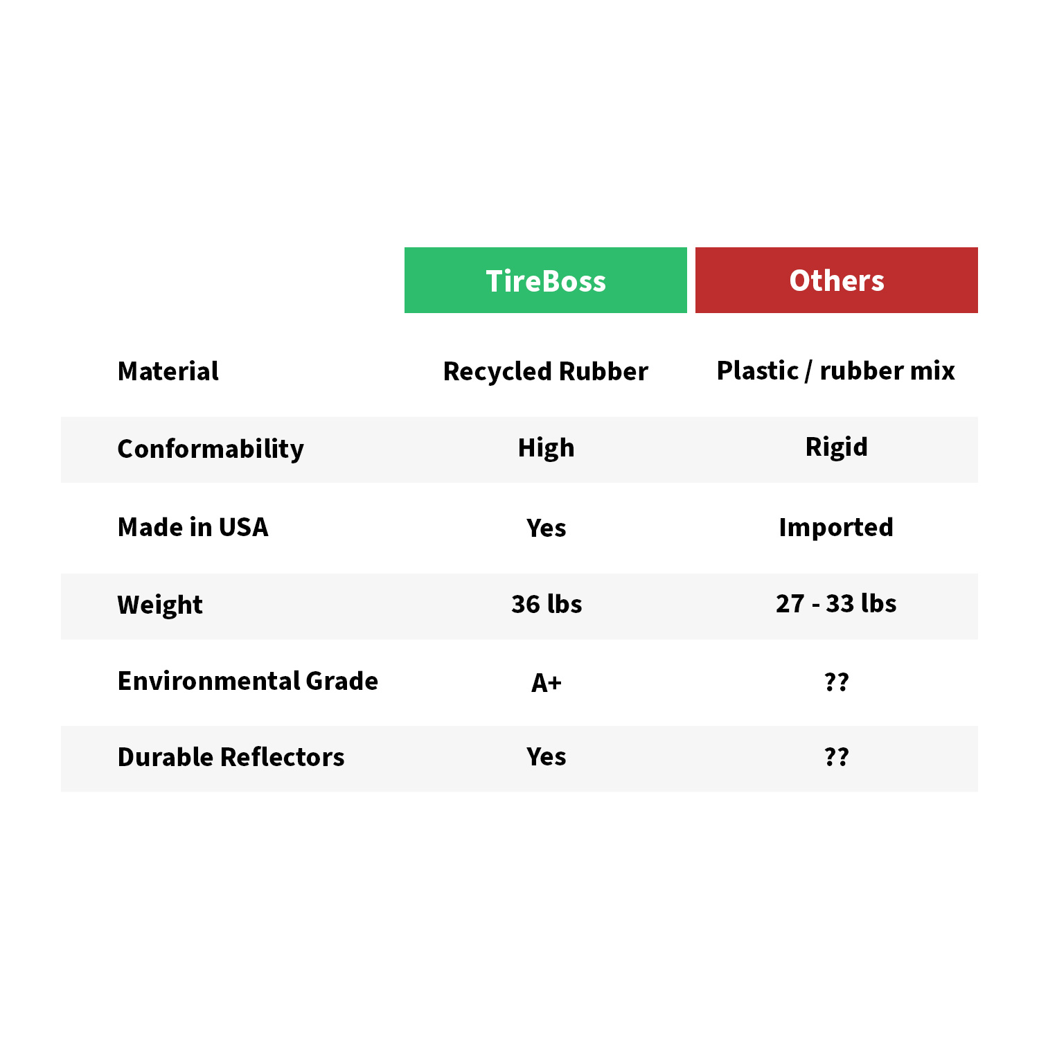 • Eco Friendly. TireBoss is made of 100% recycled rubber – old tires. Let’s keep old tires out of our landfills.
