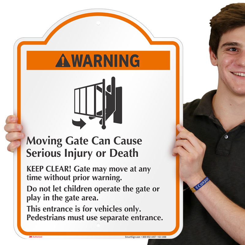 24 in. x 18 in. SignatureSign: Warning, Moving Gate Can Cause Serious Injury or death, Keep Clear, Entry for Vehicles Only, Pedestrian Use Separate Entrance Learn More...