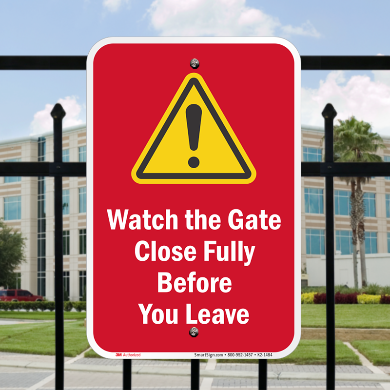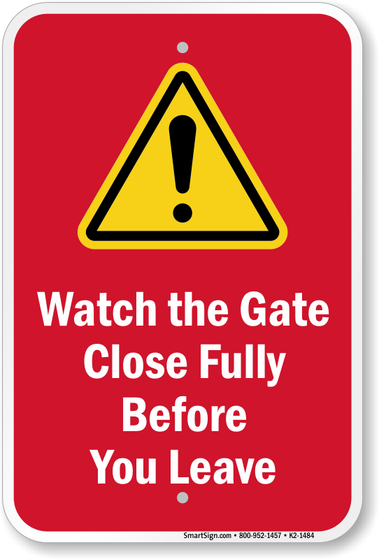 Gate Sign: Watch the Gate Close Fully Before You Leave Learn More...