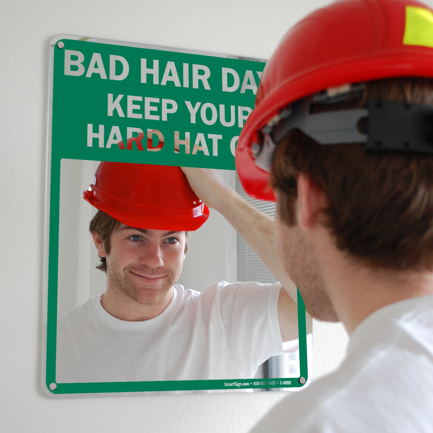 Use a "Bad Hair Day? Keep Your Hard Hat On!" Mirror Safety Message Sign to remind workers to wear their Hard Hat to prevent their hair from damaging. This Clear sign gets the message across.