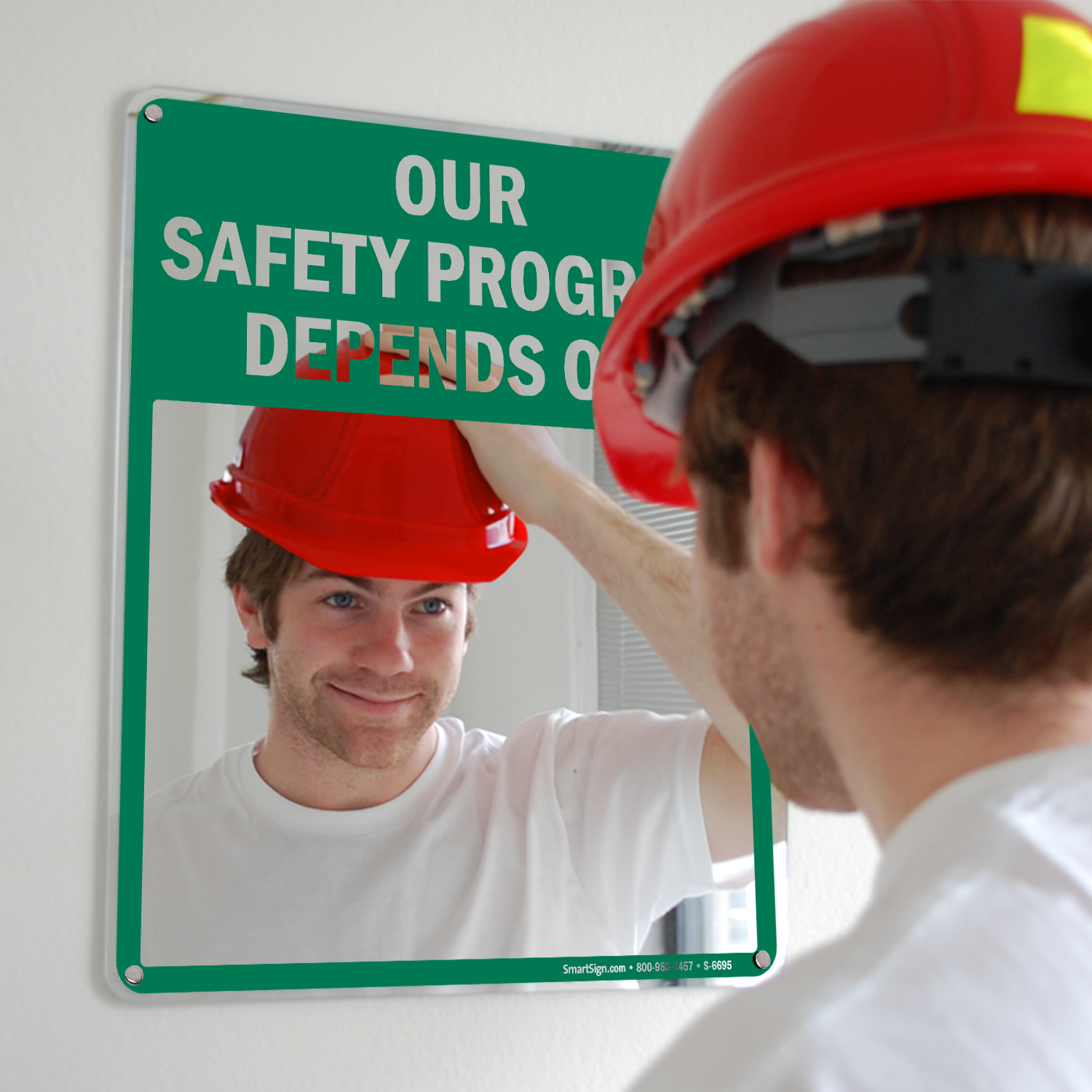 A sign is a necessary and effective way to comply with safety regulations of all kinds. Hang these "Our Safety Program Depends On:" Mirror Message Safety Sign. Show you care.