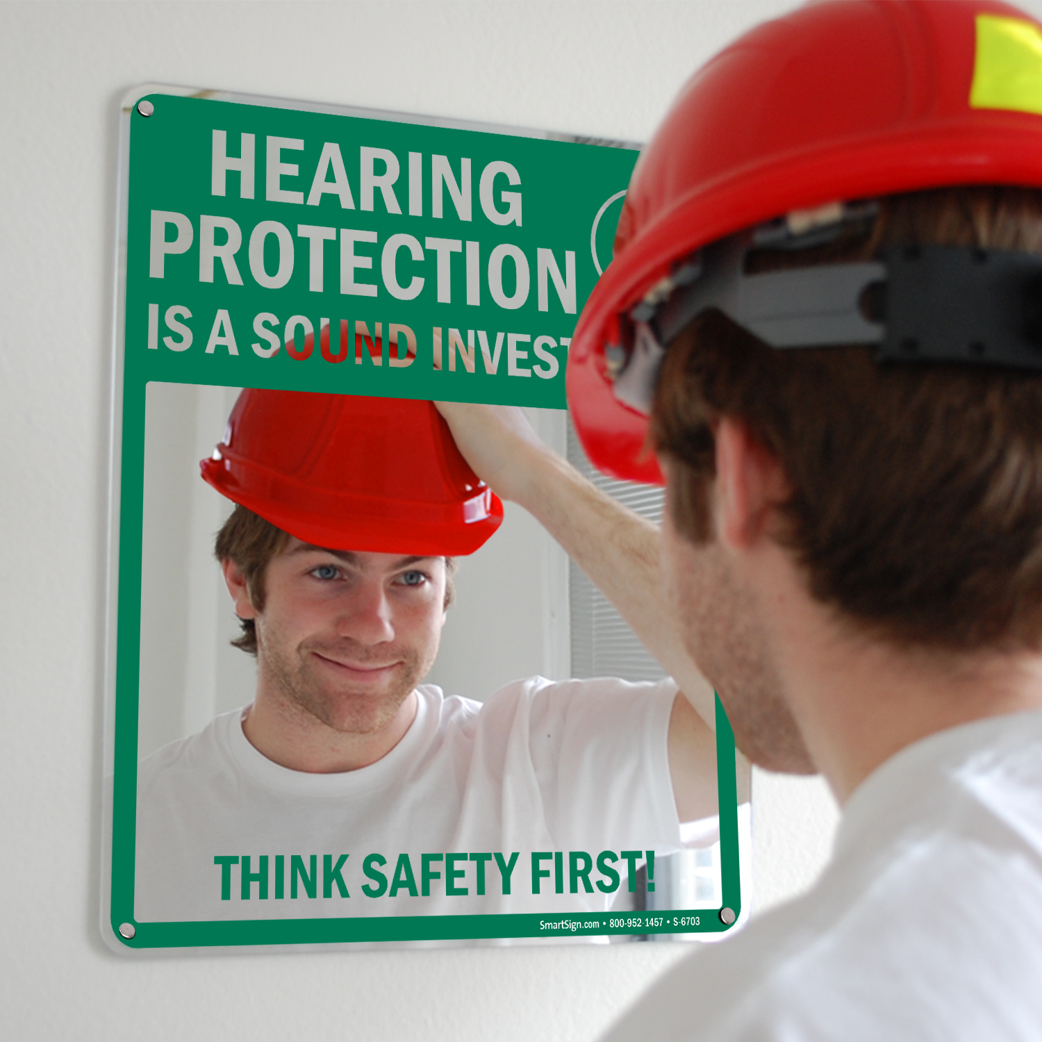 Use a "Hearing Protection is a Sound Investment, Think Safety First!" Mirror Safety Message Sign. Bold sign gets your message across. Our signs are more attention-grabbing and durable than the competition.