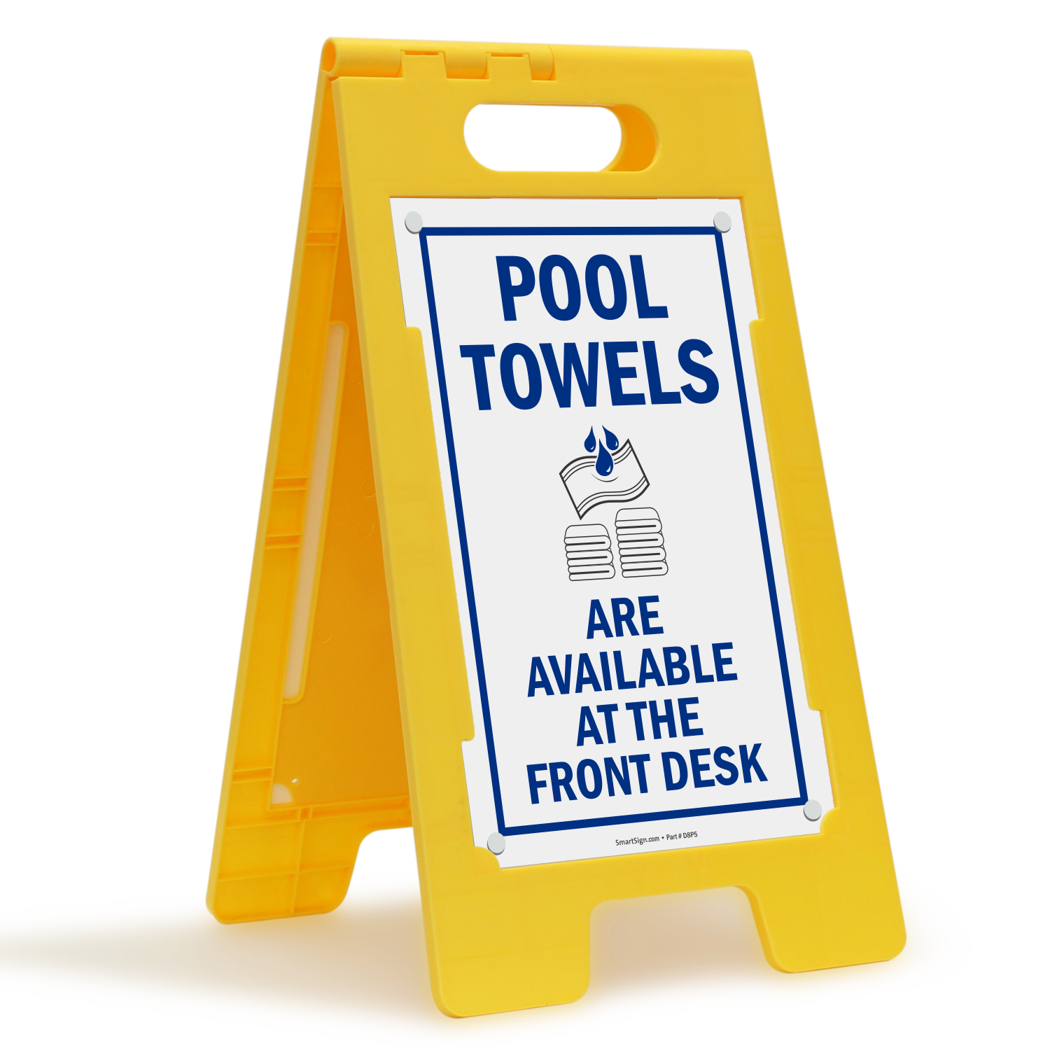 Inform swimmers of facilities like pool towels with a prominent floor standing sign.