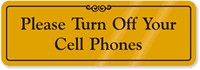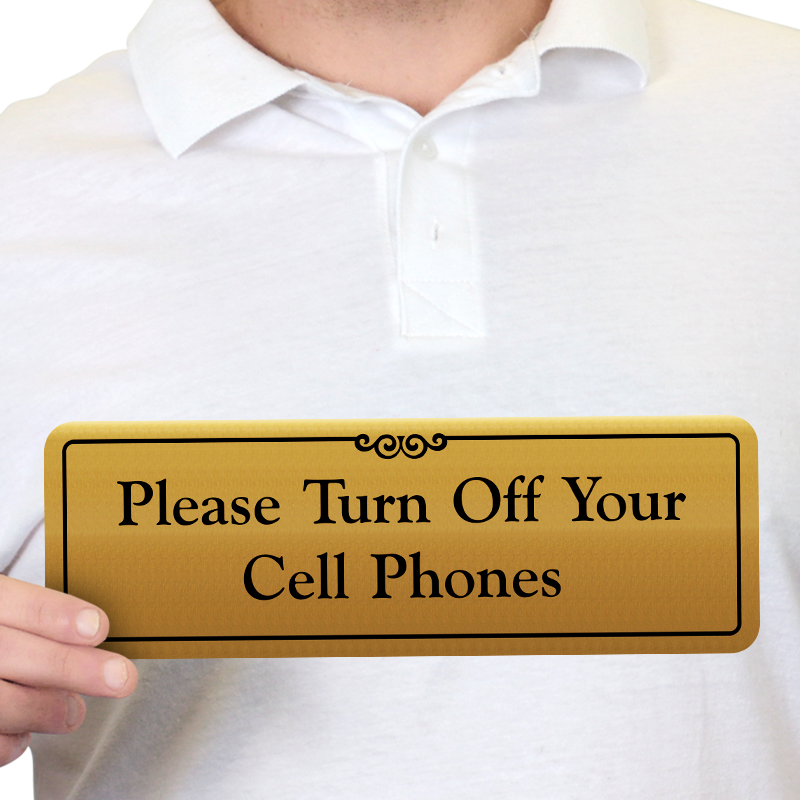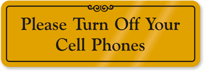 Highly durable aluminum sign informs people to turn off cell phones in a polite manner. This isn't just a designer door sign though; this premium door sign withstands at-door abuse and lots off traffic.