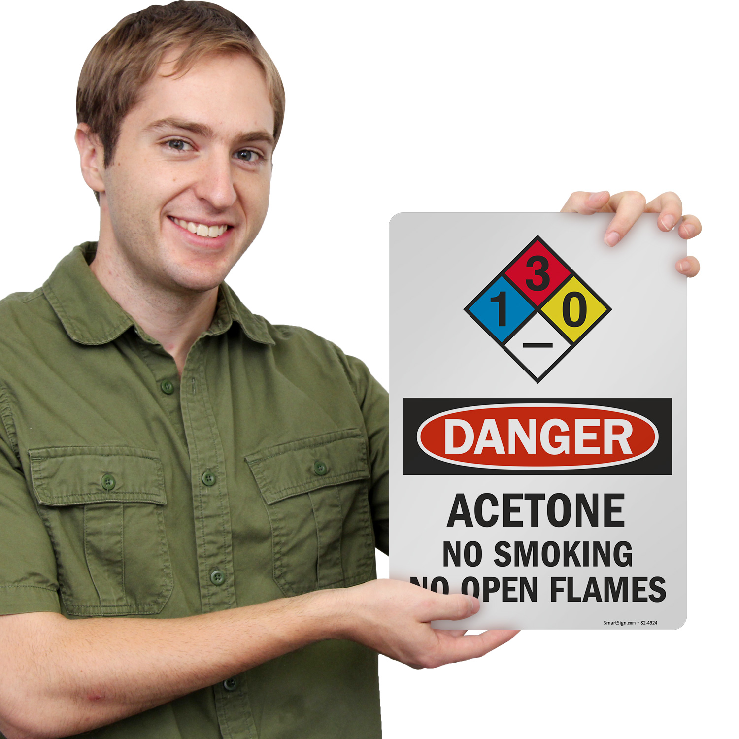 OSHA Danger Acetone sign feature the NFPA hazcom system to alert your facility of this potential risk. This sign features NFPA rating 1 for the health hazard (blue diamond), indicating there is a slight health risk.