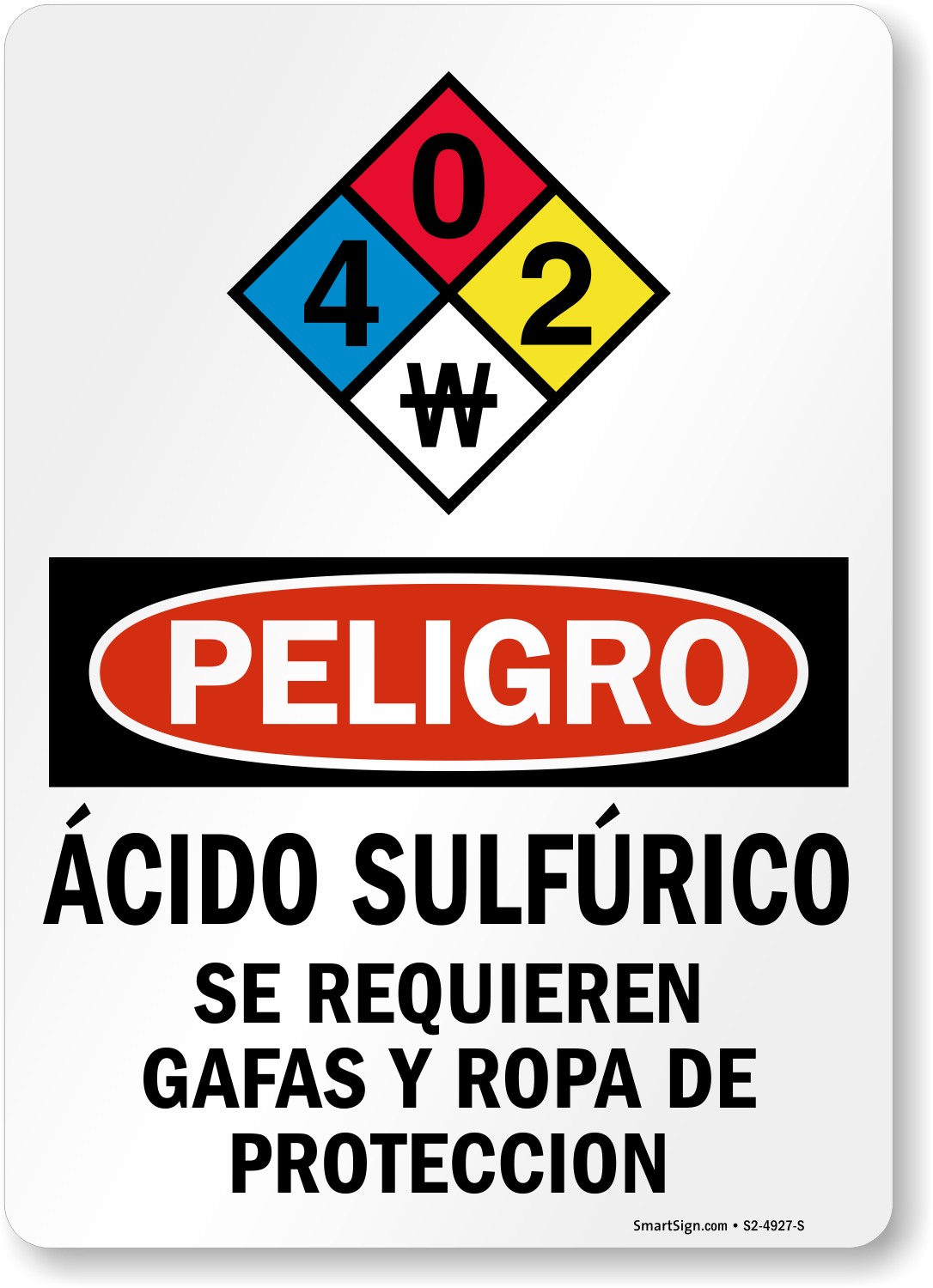 OSHA Danger (Spanish) Ácido Sulfúrico sign feature the NFPA hazcom system to alert your facility of this potential risk. This sign features NFPA rating 1 for the health hazard (blue diamond), indicating there is a slight health risk.