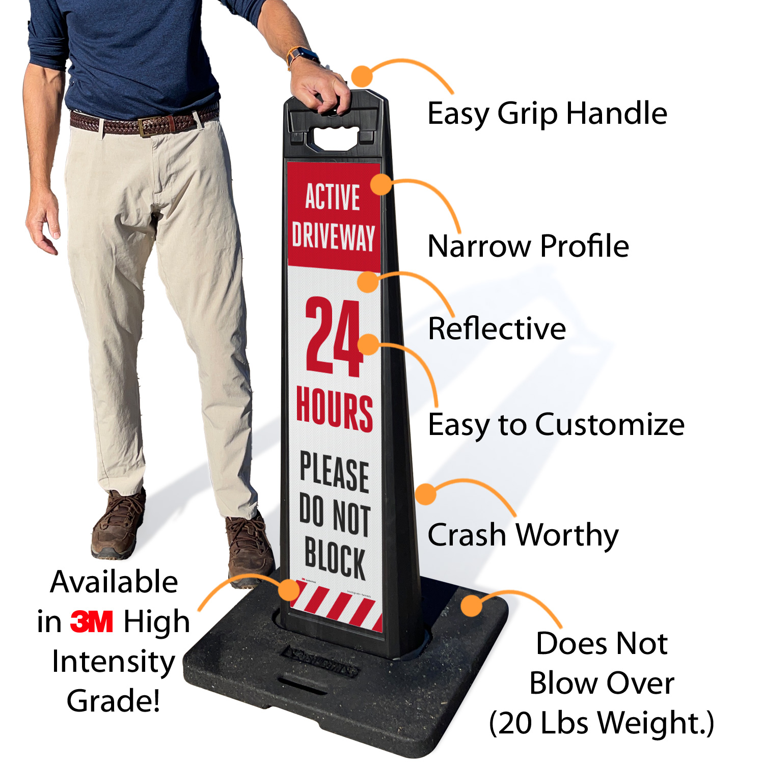Sign panel and base are stackable for compact storage.