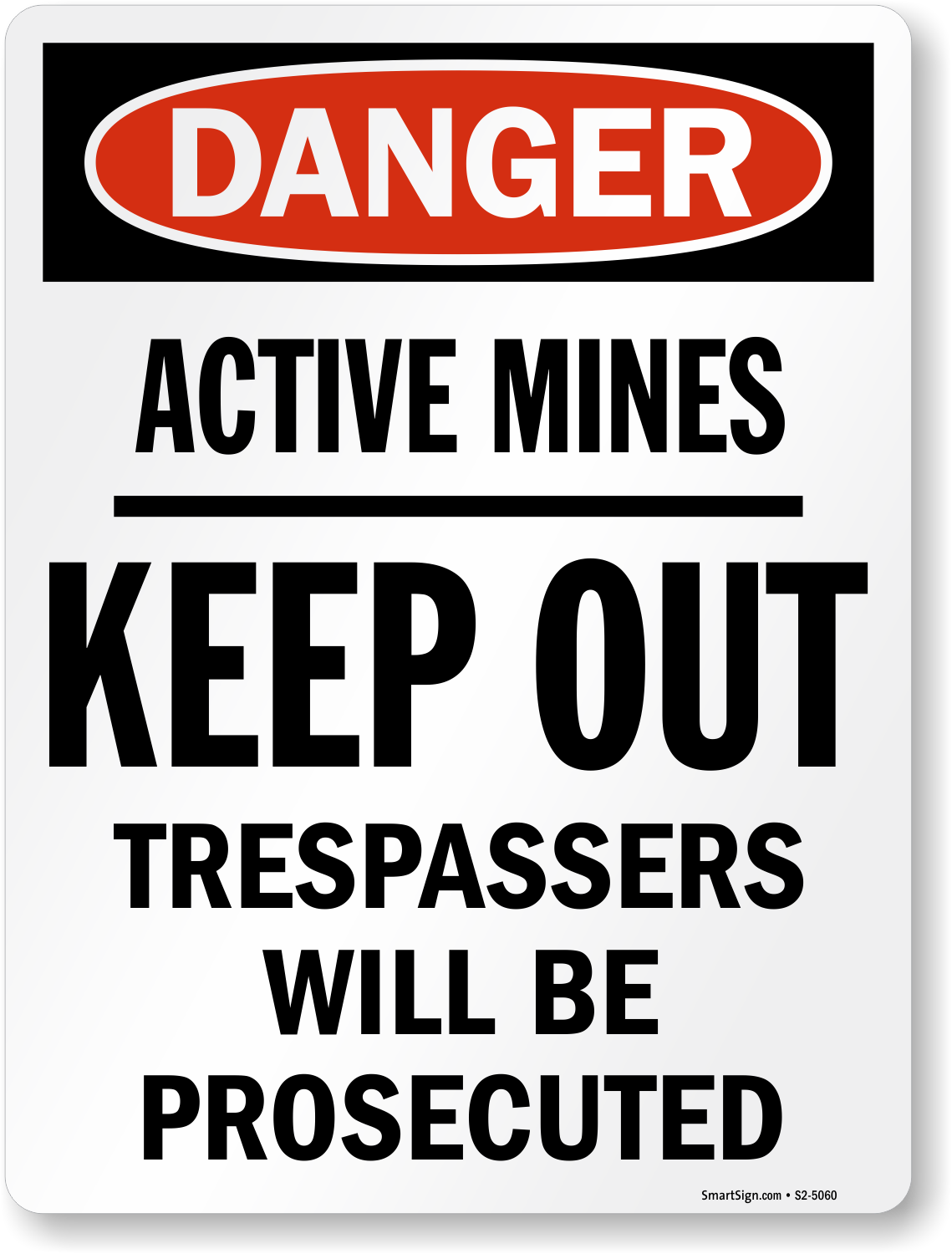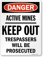 OSHA Danger Sign: Active Mines - Keep Out, Trespassers Will Be Prosecuted S2-5060