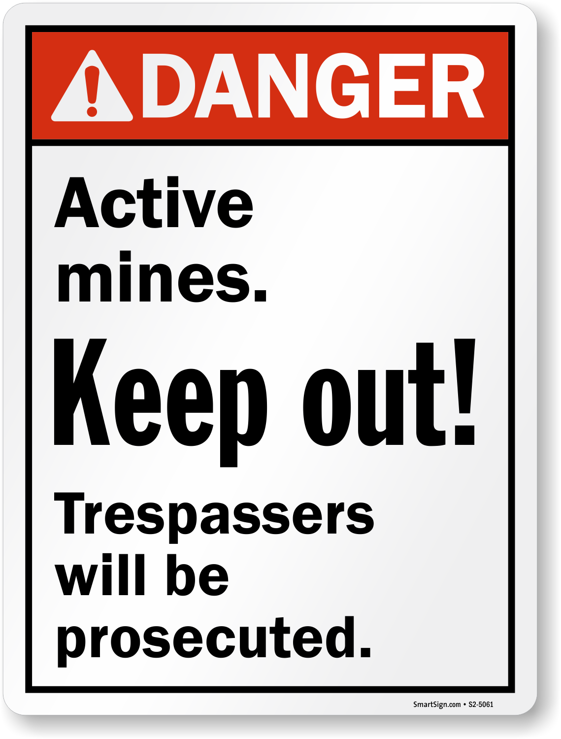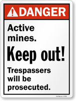ANSI Danger Sign: Active Mines. Keep Out! Trespassers Will Be Prosecuted S2-5061