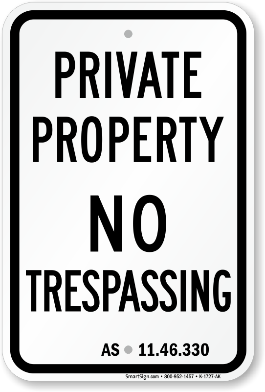 Alaska No Trespassing Sign: Private Property – AK Stat. § 11.46.330 K-1727-AK Learn More...