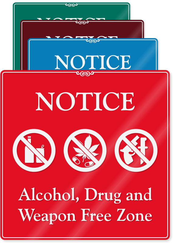 Inform everyone that they are in an alcohol, drug, and weapon free zone by installing this Notice Showcase Wall sign. A choice of designer colors and an elegant border ensures that the product complements your décor.