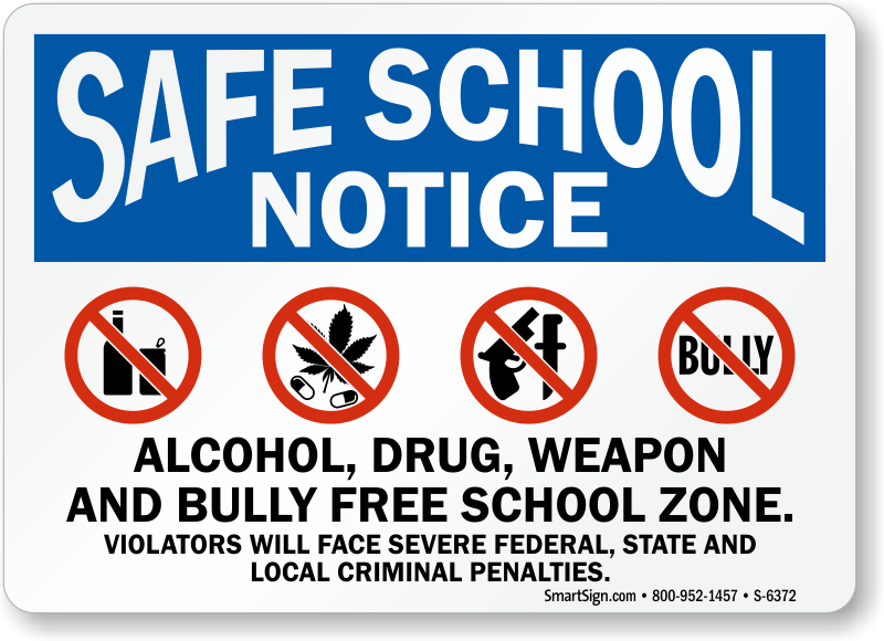School Safety Sign: Safe School Notice - Alcohol, Drug, Weapon And Bully Free School Zone S-6372
