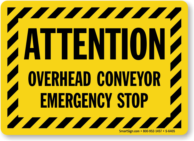 This sign with striped border immediately grabs attention towards the emergency stop switch or lever of overhead conveyor.