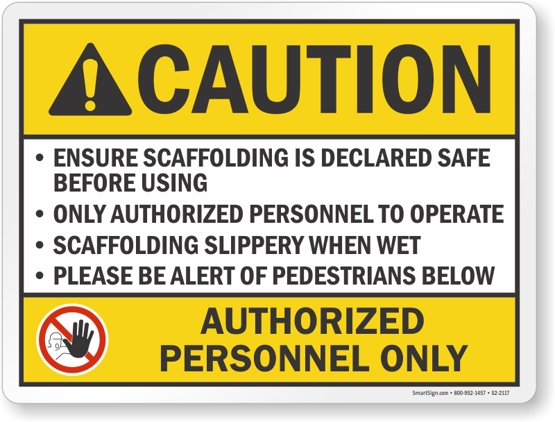 ANSI Caution Sign: Authorized Personnel Only, Ensure Scaffolding Is Declared Safe Before Using S2-2117 Learn More...