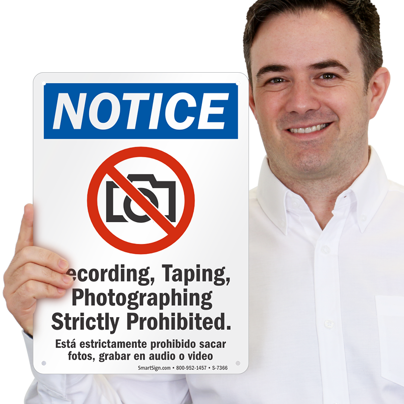 Bilingual Notice No Cameras Allowed Sign: Recording, Taping, Photographing Strictly Prohibited S-7366