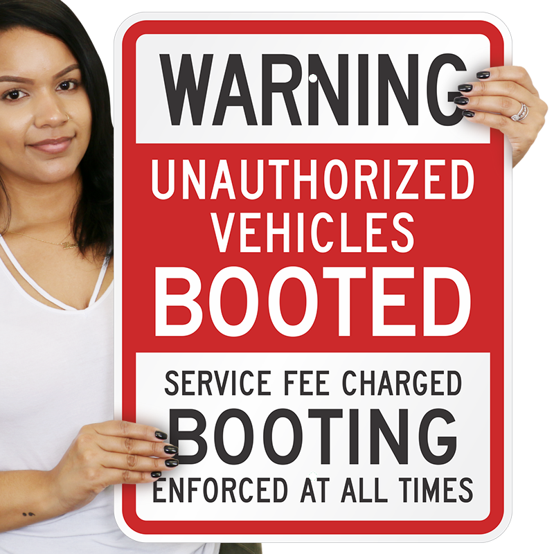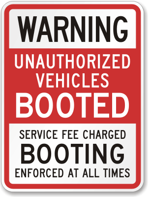 Auto Boot Parking Sign: Warning Unauthorized Vehicles Booted Service Fee Charged Booting Enforced At All Times Learn More...