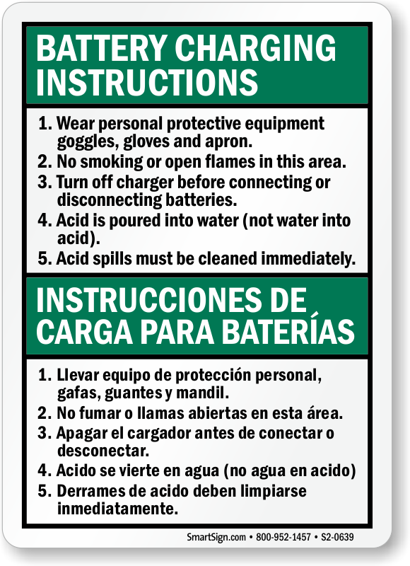 Bilingual Battery Charging Area Sign: Battery Charging Instructions / Instrucciones De Carga Para Baterias