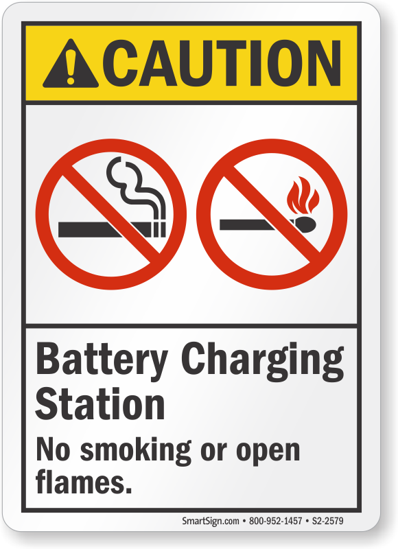 ANSI Caution Sign: Battery Charging Station, No Smoking Or Open Flames