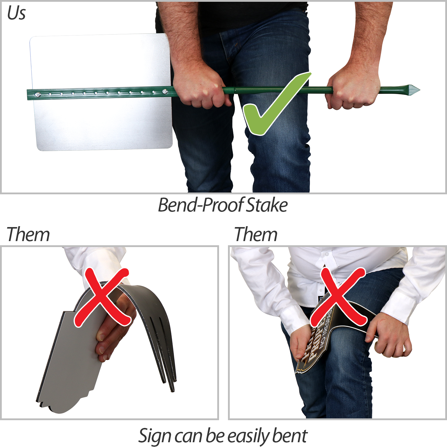 Heavy-duty, bend-proof stake with anti-twist flanged support tabs and a pointed insert end keeps sign from turning.