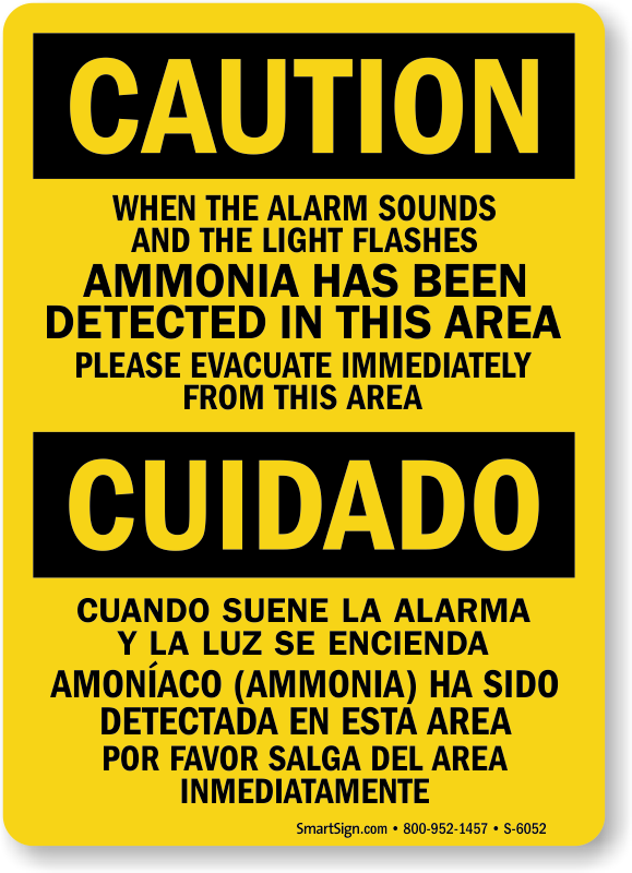 Identify areas exposed to chemicals. Use a Bilingual OSHA Caution Sign to inform everyone that Ammonia Has Been Detected In This Area and that people should keep out.
