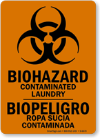 A forewarning about Biohazard Contaminated Laundry in the facility should be given to the workers. Install this bilingual sign with a universal biohazard symbol to demarcate the area where laundry contaminated with infectious substance is kept in your facility.