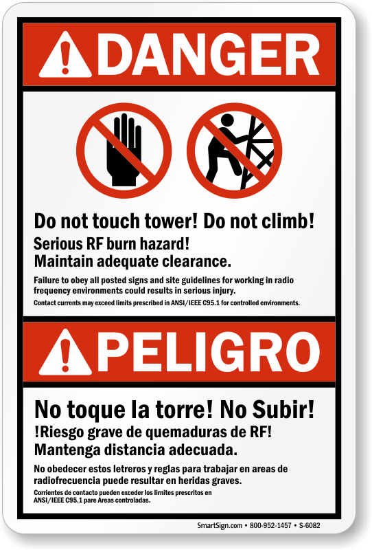 Bilingual signs leave no possibility that your multicultural workforce won't understand a warning. Give them a heads up of RF burns on touching AM radio broadcast towers, with our ANSI Danger Sign.