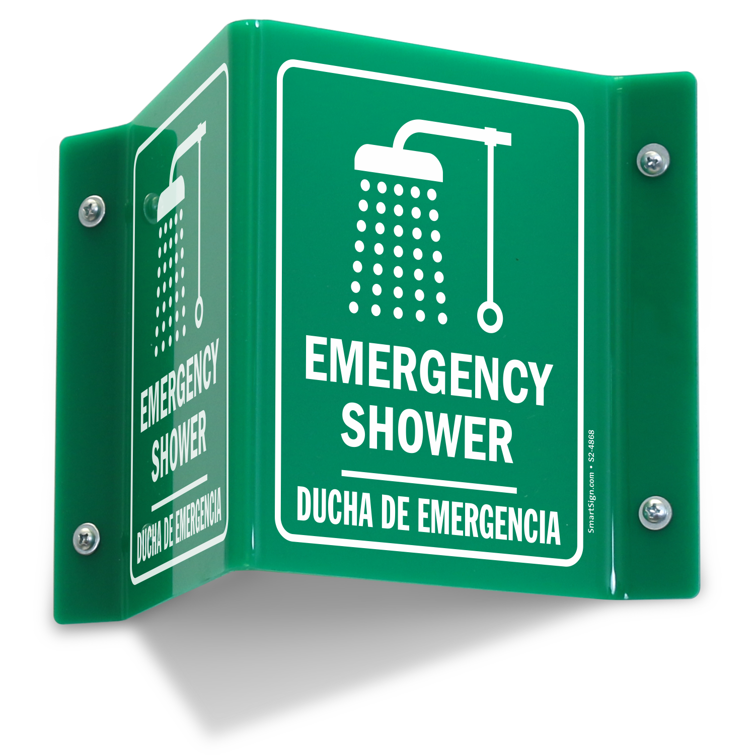 Emergency Shower sign has both English and Spanish text for a wider reach.