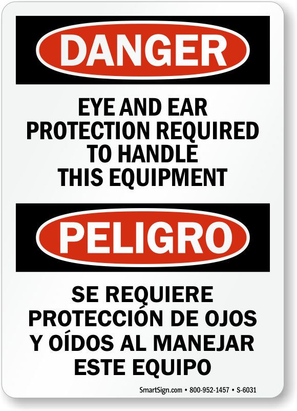 Wearing PPE is important! Inform everyone that Eye And Ear Protection Required To Handle This Equipment, with this Bilingual OSHA Danger Sign.