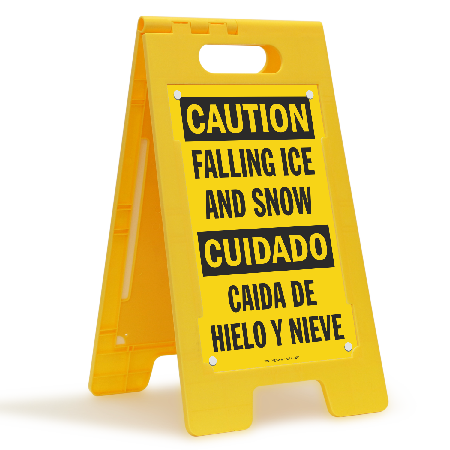 With one sign, address both - English as well as Spanish speakers. Warn them of the dangers of falling ice and snow.