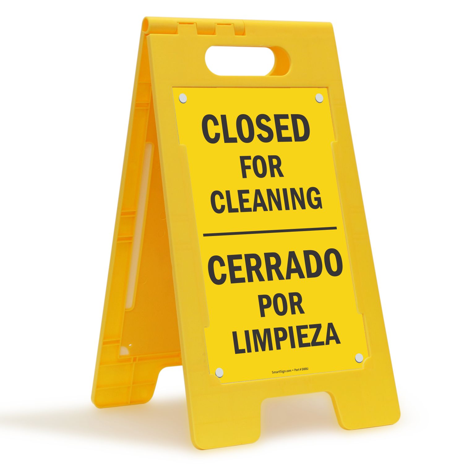 While the restroom is being cleaned, put up this free-standing bilingual closed for cleaning sign so everyone knows the restroom is off limits. By using this sign all Spanish and English speakers will know that they cannot enter the restroom.