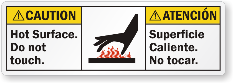 Bring a hot surface to notice by applying this bilingual ANSI label with a graphic.