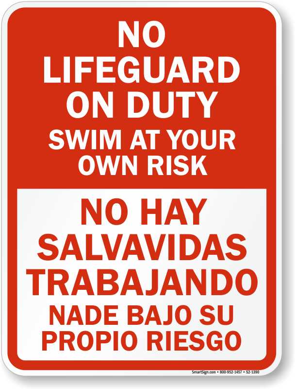Bilingual No Lifeguard on Duty Sign: No Lifeguard on Duty, Swim At Your Own Risk/No Hay Salvavidas Trabajando, Nade Bajo Su Propio Riesgo S2-1390 Learn More...