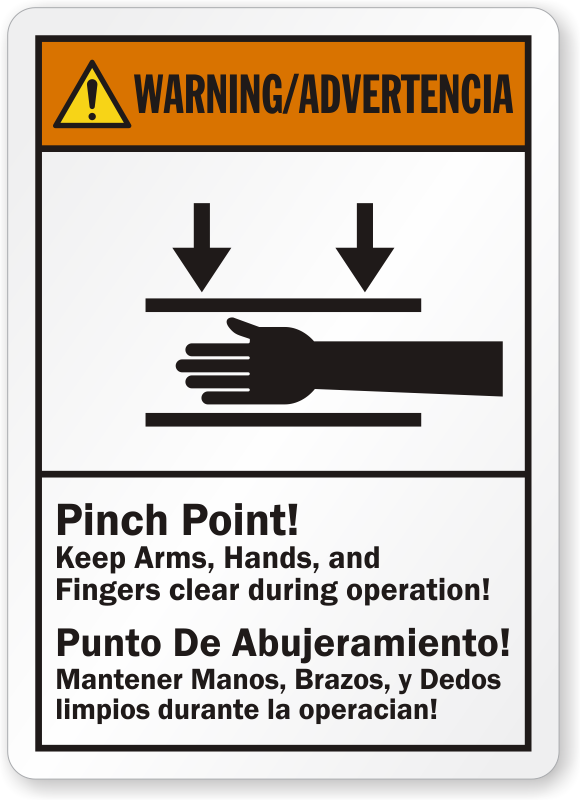 This bilingual ANSI label will save workers from pinch point hazards. Apply this on the machines so that workers are reminded to keep their body parts away while operating it.
