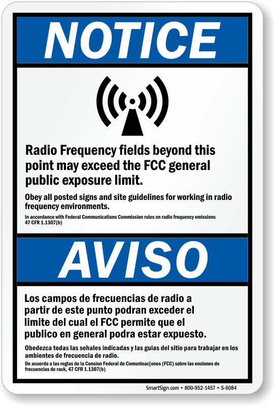 Post a bilingual ANSI Notice sign to keep workers safe when the radio frequency field levels exceed FCC limit.