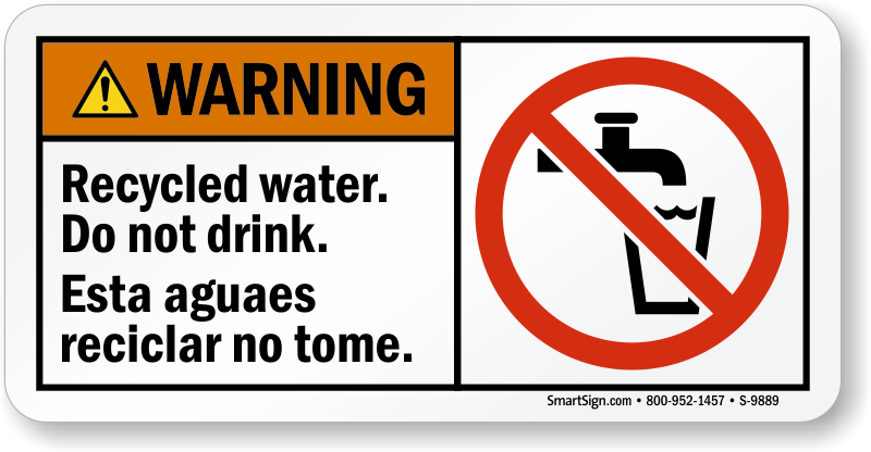 Use this bilingual warning sign to let people know about recycled water. People would stay far away if they knew what they were drinking. Though some might need a reminder not to actually drink the water.
