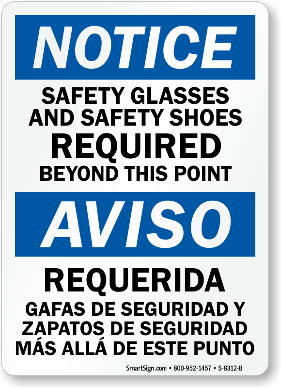 When language can become a barrier in hazard communication, a bilingual sign works best. Bilingual OSHA Notice Safety Glasses And Safety Shoes Required Beyond This Point Sign has text in English and Spanish for a wider audience.
