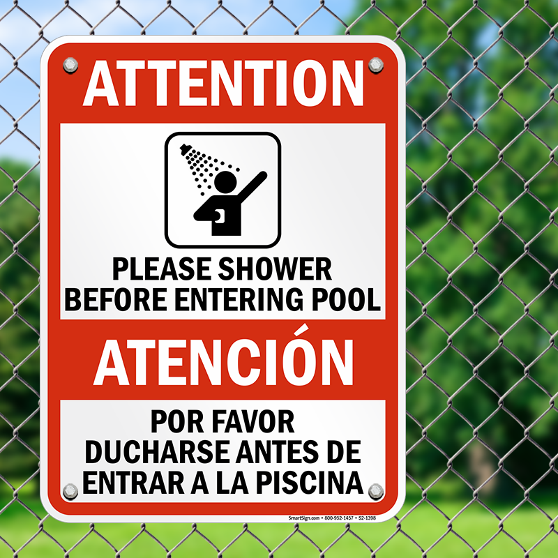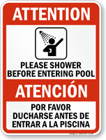 Bilingual Pool Sign: Attention, Shower Before Entering Pool/Atencion, Por Favor Ducharse Antes De Entrar A La Piscina with Graphic S2-1398 Learn More...