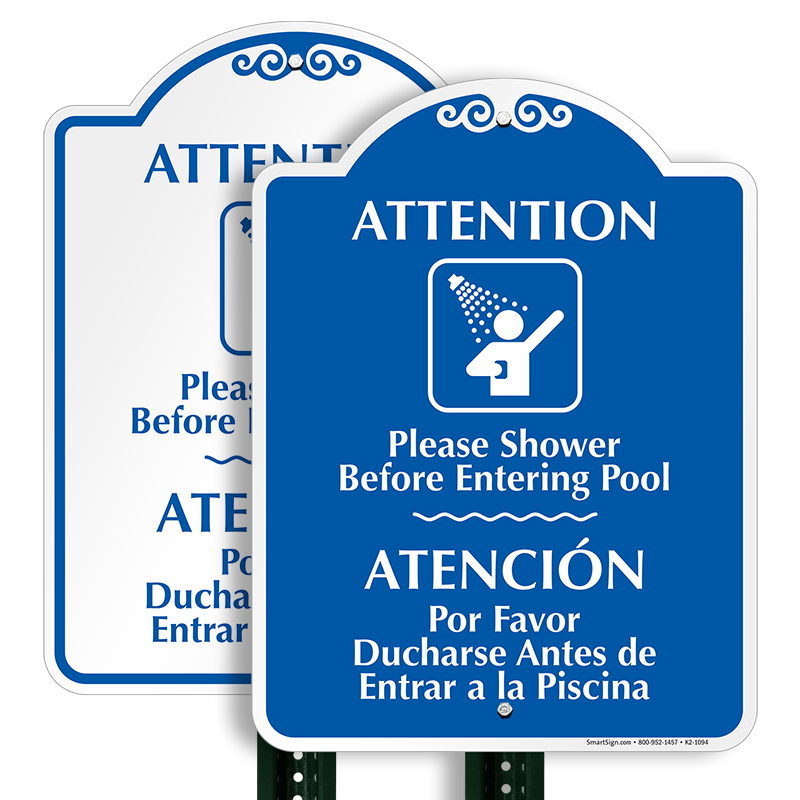 Bilingual 24 in. x 18 in. SignatureSign: Attention, Shower Before Entering Pool/Atencion, Por Favor Ducharse Antes De Entrar A La Piscina with Graphic K2-1094 Learn More...