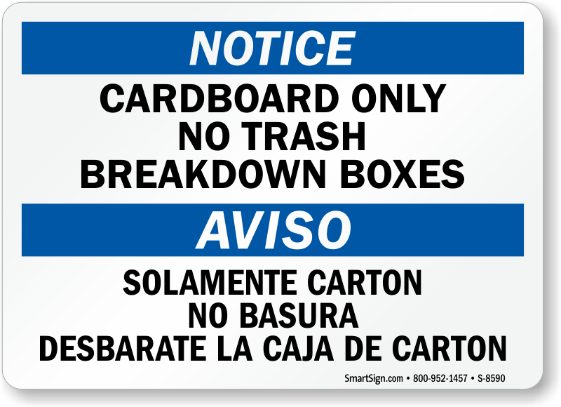 Bilingual Recycling Sign: Notice Cardboard Only No Trash Breakdown Boxes - Aviso Solamente Carton No Basura Desbarate la Caja de Carton S-8590 Learn More...