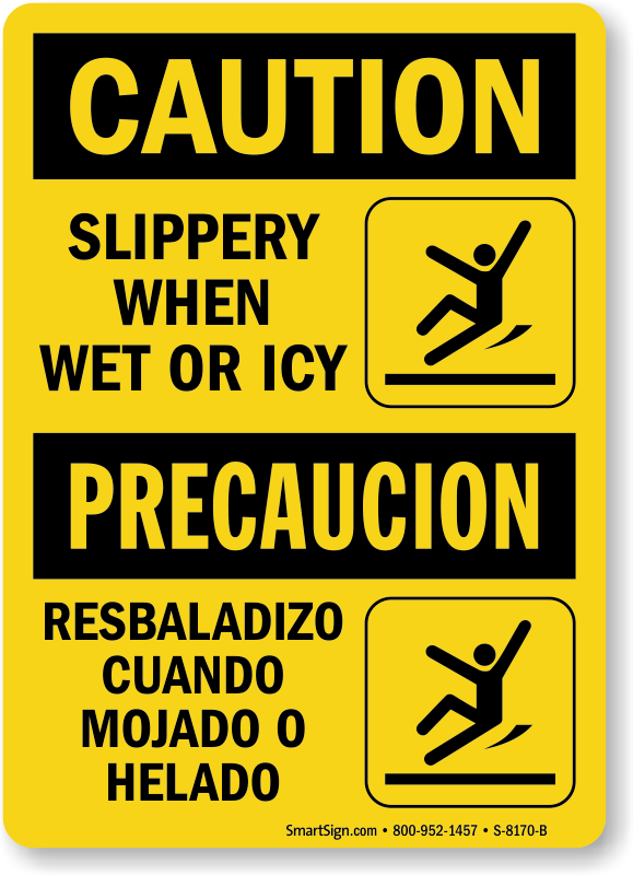 Message in dual language enhances safety at workplace by cautioning a larger workforce. This bilingual sign cautions worker against slip hazards of wet or icy floor.
